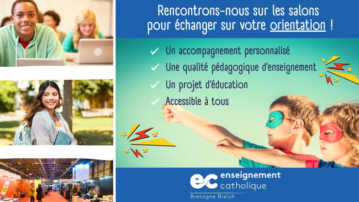 Venez aux salons, à notre rencontre pour échanger sur votre orientation et poser vos questions aux établissements de l'Enseignement catholique de Bretagne. Nous sommes 1069 établissements sur le territoire, prêts à vous accompagner dans votre projet et avons plus 600 formations à vous proposer dans de nombreux secteurs d'activité.